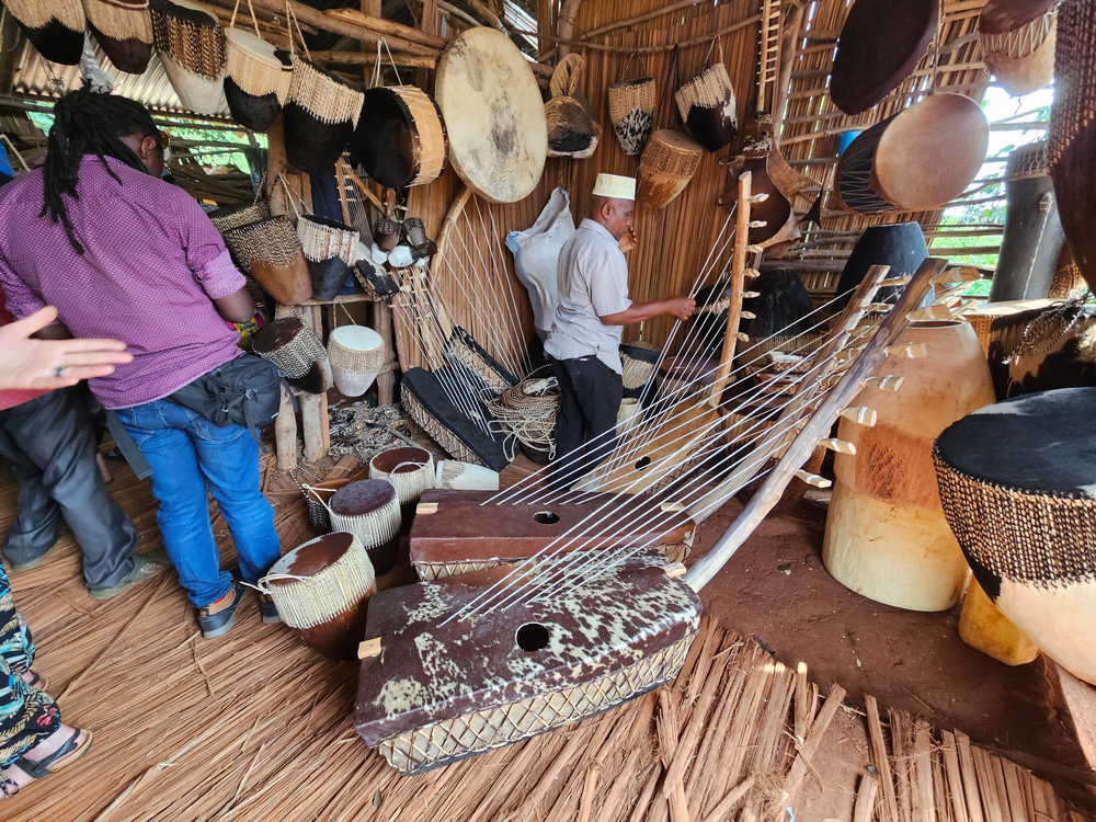 Workshop met de Nile Beat band. De Akogo (duimpiano) speelt hier een belangrijke rol. Na afloop kunnen zulke professionele duimpiano’s ook worden gekocht.